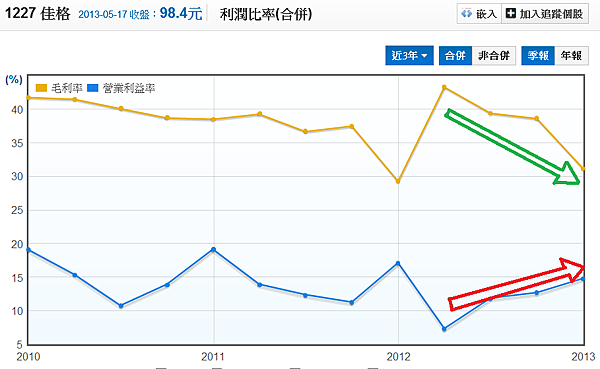 食品大廠佳格(1227)於5/15公布2013年第一季財報。該公司今年第一季合併營收達到50.76億元,年增達20%,毛利率提升到31.17%,較去年同期上升1.9個百分點,雖然管理費用略減,但推銷費用增加,因此首季營業利益達到7.49億元、僅年增4%,首季營業利益率14.76%,亦低於去年同期(17.09%),稅前淨利約8.42億元,年增約7%,稅後淨利近7億元,年增約12%,第一季每股稅後盈餘達1.23元,優於去年同期(1.09元)。