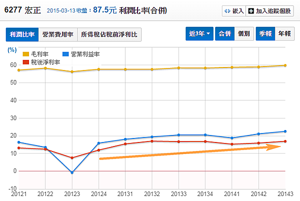 宏正的毛利率將近有60%,2012年Q3開始營益率及稅後淨利緩步上升(KVM全球市佔第二)