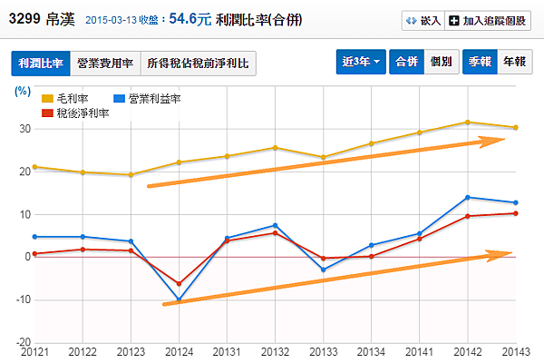 2013年開始,毛利率、營益率開始改善。2014第二季開始,營運成果開始開花結果。